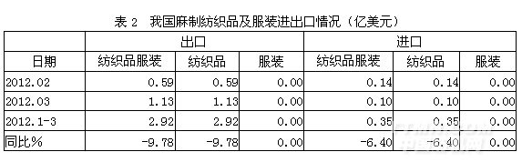 根据中国海关的统计数据,我国2012年1-3月份麻制纺织品及服装出口总额2.92亿美元,同比减少9.78%,占纺织品及服装出口总额515.68亿美元的0.57%;其中1-3月份麻制纺织品出口总额2.92亿美元,同比减少9.78%,占纺织品出口总额217.66亿美元的1.34%;