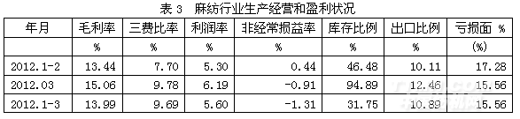 从企业生产经营和盈利状况看,麻纺织行业毛利率2012年1-3月份为13.99%,三费比率(营业、管理和财务费用率之和)为9.69%,利润率为5.60%,如果剔除非经常性损益的影响,名义税前利润率为4.29%;该行业库存比率为31.75%,表明产品销售正常;出口比例为10.89%,表明出口状况较好;该行业亏损面为15.56%。由此可见,在麻纺织行业中,生产经营状况运作得较好。