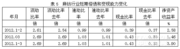 麻纺织行业资产负债率2012年1-3月份为49.24%,表明财务政策的运作比较稳健;净资产收益率为3.90%,表明该行业净资产运作效率较高。