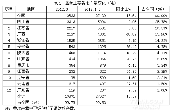 全国蚕丝2012年1-3月份产量合计为2.71万吨,比上年同期增加13.64%;其中产量最大的省市是四川省,产量为0.70万吨,为省市龙头;其次是江苏省,产量0.56万吨,位居亚军;然后是广西,产量0.43万吨,荣立第三;浙江省0.39万吨,为第四;安徽省0.13万吨,占第五;陕西省0.11万吨,位居第六;接下来是山东省0.11万吨,为第七;重庆市0.09万吨,占第八;江西省0.06万吨,位居第九;辽宁省0.06万吨,为第十名;云南省0.04万吨,居第11名;广东省0.03万吨,荣立第12名。上述12大省市2012年1-3月份产量合计为2.70万吨,占全国2012年1-3月份总产量的99.62%。