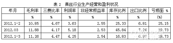 从企业生产经营和盈利状况看,真丝行业毛利率2012年1-3月份为11.26%,三费比率(营业、管理和财务费用率之和)为4.47%,利润率为4.25%,如果剔除非经常性损益的影响,名义税前利润率为6.79%;该行业库存比率为16.83%,表明产品销售正常;出口比例为6.97%,表明出口状况较好;该行业亏损面为19.73%。由此可见,在真丝行业中,生产经营状况运作得较好。