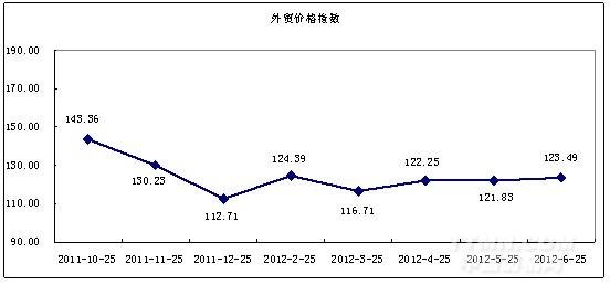 如图所示,2012年6月份外贸景气指数收于1513.64点,较5月份上调1.76%,去年同比下跌13.04%;外贸价格指数收于123.49点,较5月份上调1.36%,去年同比下跌9.78%。外贸信心指数收于1022.08点,较5月份下跌2.73%。
