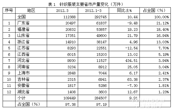 从2012年3月份的情况看,全国针织服装当月总产量为11.24亿件,上述12大省市的当月产量合计为10.94亿件,占全国当月总产量的97.38%;由此可见,我国前12大省市的针织服装产量约占全国总产量的绝大部分。