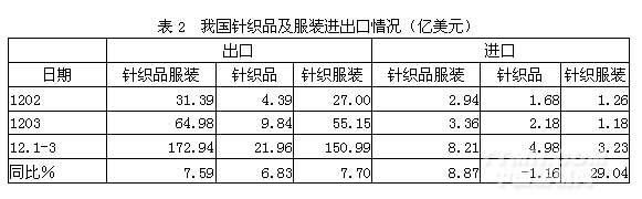 根据中国海关的统计数据,我国2012年1-3月份针织品及服装出口总额172.94亿美元,同比增加7.59%,占纺织品及服装出口总额515.68亿美元的33.54%;其中1-3月份针织品出口总额21.96亿美元,同比增加6.83%,占纺织品出口总额217.66亿美元的10.09%;1-3月份针织服装出口总额150.99亿美元,同比增加7.70%,占服装出口总额298.02亿美元的50.66%;