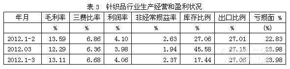 从企业生产经营和盈利状况看,针织品行业毛利率2012年1-3月份为13.11%,三费比率(营业、管理和财务费用率之和)为6.68%,利润率为4.06%,如果剔除非经常性损益的影响,名义税前利润率为6.43%;该行业库存比率为17.44%,表明产品销售正常;出口比例为27.06%,表明出口状况较好;该行业亏损面为23.98%。由此可见,在针织品行业中,生产经营状况运作得较好。