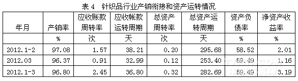 从产销衔接情况看,2012年1-3月份针织品行业产销率为96.80%,表明该行业产品销售状况较好;应收账款周转率(主营收入/应收账款净额)为2.45次;应收账款运转周期(90天/应收账款周转率)为36.80天,应收账款周转次数越多,或者应收账款周转天数越少,表明其实现利润的通道越加通畅。