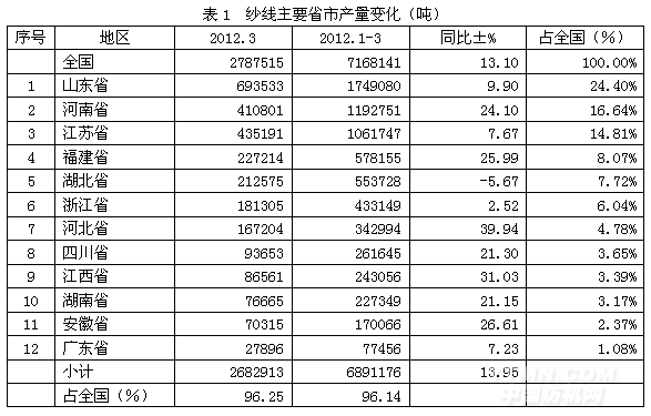 全国纱2012年1-3月份产量合计为716.81万吨,比上年同期增加13.10%;其中产量最大的省市是山东省,产量为174.91万吨,为省市龙头;其次是河南省,产量119.28万吨,位居亚军;然后是江苏省,产量106.17万吨,荣立第三;福建省57.82万吨,为第四;湖北省55.37万吨,占第五;浙江省43.31万吨,位居第六;接下来是河北省34.30万吨,为第七;四川省26.16万吨,占第八;江西省24.31万吨,位居第九;湖南省22.73万吨,为第十名;安徽省17.01万吨,居第11名;广东省7.75万吨,荣立第12名。上述12大省市2012年1-3月份产量合计为689.12万吨,占全国2012年1-3月份总产量的96.14%。