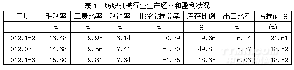 从企业生产经营和盈利状况看,纺织机械行业毛利率2012年1-3月份为15.80%,三费比率(营业、管理和财务费用率之和)为9.81%,利润率为7.34%,如果剔除非经常性损益的影响,名义税前利润率为5.99%;该行业库存比率为18.65%,表明产品销售正常;出口比例为6.06%,表明出口状况较好;该行业亏损面为18.52%。由此可见,在纺织机械行业中,生产经营状况运作得较好。