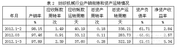 从产销衔接情况看,2012年1-3月份纺织机械行业产销率为97.89%,表明该行业产品销售状况较好;应收账款周转率(主营收入/应收账款净额)为2.39次;应收账款运转周期(90天/应收账款周转率)为37.60天,应收账款周转次数越多,或者应收账款周转天数越少,表明其实现利润的通道越加通畅。