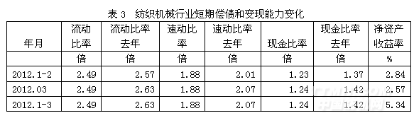 从短期偿债和变现能力的变化看,纺织机械行业流动比率(流动资产/流动负债)2012年1-3月份为2.49倍,而上年同期为2.63倍,流动比率较高,表明企业短期偿债能力较强;
