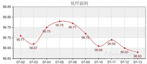 7月13日,据商务部中国.盛泽丝绸化纤指数的数据监测显示,今日化纤指数全线走跌。今日,商务部中国.盛泽丝绸化纤指数总指数弱势走低,收盘于96.40点,与上一交易日相比,下跌了0.03点。其中,化纤面料价格指数也延续上一交易日的跌势,较上一交易日相比小幅下滑了0.02点,今日收盘于96.63点;今日化学纤维指数则连续六个交易日的下行走势,收盘于95.82点,与上一交易日相比,下降了0.04点。
