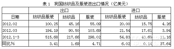 根据中国海关的统计数据,我国2012年1-3月份纺织品及服装出口总额515.68亿美元,同比增加3.41%,占全国商品出口总额4300.20亿美元的11.99%;其中1-3月份纺织品出口总额217.66亿美元,同比增加1.69%,占纺织品及服装出口总额515.68亿美元的42.21%;1-3月份服装出口总额298.02亿美元,同比增加4.71%,占纺织品及服装出口总额515.68亿美元的57.79%;