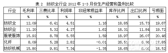 从企业生产经营和盈利状况看,纺织全行业毛利率2012年1-3月份为12.09%,三费比率(营业、管理和财务费用率之和)为6.41%,利润率为4.51%,如果剔除非经常性损益的影响,名义税前利润率为5.68%;该行业库存比率为18.85%,表明产品销售正常;出口比例为15.73%,表明出口状况较好;该行业亏损面为19.67%。由此可见,在纺织全行业中,生产经营状况运作得较好。