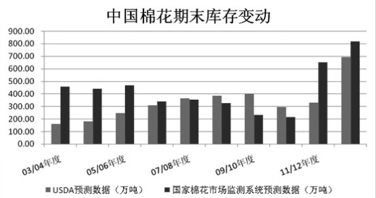 7月份数据显示,美国农业部继续上调2012/2013年度中国棉花期末库存量至692.4万吨,较上一年度大幅增加364.66万吨。另据国家棉花市 场监测系统预测,2012/2013年度国内棉花期末库存高达816万吨,与全年棉花消费量824.9万吨基本持平,未来国内棉市将进入去库存化阶段。