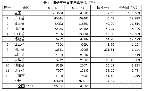 从2012年4月份的情况看,全国服装当月总产量为21.85亿件,上述12大省市的当月产量合计为20.83亿件,占全国当月总产量的95.34%;由此可见,我国前12大省市的服装产量约占全国总产量的绝大部分。