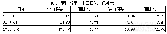 根据中国海关的统计数据,我国2012年1-4月份服装出口总额402.70亿美元,同比增加1.77%,占纺织品及服装出口总额710.03亿美元的56.72%;1-4月份服装进口总额13.99亿美元,同比增加32.06%,占纺织品及服装进口总额74.21亿美元的18.86%;显示中国服装外贸形势较好。