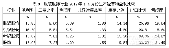 从企业生产经营和盈利状况看,服装服饰行业毛利率2012年1-4月份为15.85%,三费比率(营业、管理和财务费用率之和)为8.60%,利润率为5.39%,如果剔除非经常性损益的影响,名义税前利润率为7.25%;该行业库存比率为14.14%,表明产品销售正常;出口比例为25.96%,表明出口状况较好;该行业亏损面为19.64%。由此可见,在服装服饰行业中,生产经营状况运作得较好。