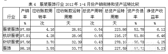从产销衔接情况看,2012年1-4月份服装服饰行业产销率为97.89%,表明该行业产品销售状况较好;应收账款周转率(主营收入/应收账款净额)为4.16次;应收账款运转周期(120天/应收账款周转率)为28.81天,应收账款周转次数越多,或者应收账款周转天数越少,表明其实现利润的通道越加通畅。
