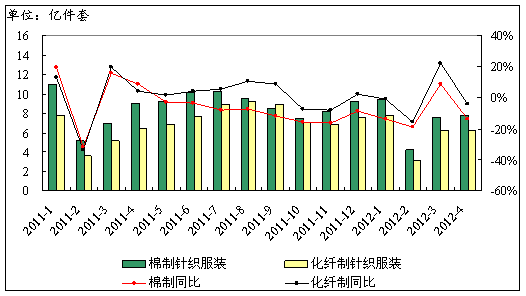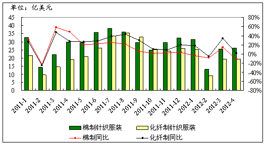 据国家棉花市场监测系统搜集整理的数据显示,2012年4月,我国服装(包括服装及衣着附件)出口额103.94亿美元,同比减少6.42%。其中,棉制针织服装出口量为7.77亿件套,同比减少13.6%,出口额26.30亿美元,同比减少11.70%;棉制梭织服装出口量为2.52亿件套,同比减少15.20%,出口额16.18亿美元,同比减少14.70%;化纤制针织服装出口量为6.22亿件套,同比减少4.4%,出口额19.50亿美元,同比增长1.50%;化纤制梭织服装出口量为4.15亿件套,同比减少6.90%,出口额15.07亿美元,同比减少6.70%。