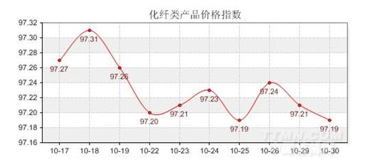 10月30日,据商务部中国•盛泽丝绸化纤指数的数据监测显示,今日化纤指数全线走低,商务部中国.盛泽丝绸化纤指数总指数收盘于97.19点,与上一交易日相比,下跌0.03点。其中,化纤面料价格指数收盘于97.51点,较昨日微跌0.02点;化学纤维指数继续走低,收盘于96.01点,较昨日下跌0.03点。