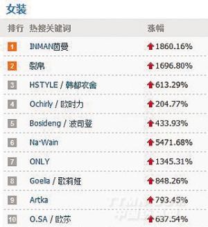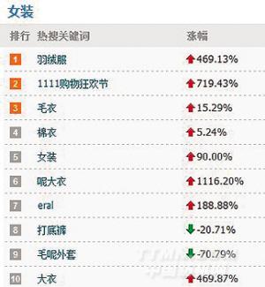 女装热搜关键词:“茵曼”、“羽绒服”