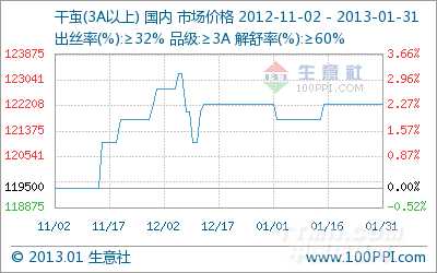 2012年,我国茧丝价格总体呈上行走势,部分时段价格波动较大,但全年价格整体低于去年。据中国茧丝绸交易市场统计,2012年国内干茧和生丝价格分别为10.64万元/吨和33.28万元/吨,同比分别下降3.7%和4.2%。