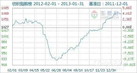 1月31日纺织指数为1069点,较周期内最高点1071点(2013-01-25)下降了0.19%,较2012年07月01日最低点930点上涨了14.95%。(注:周期指2011-12-01至2013-01-31)
