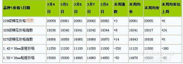 3月4日-3月8日,本周棉花现货价格仍旧是稳中坚挺的态势,因此棉纱报价也保持着坚挺的行情;涤纶短纤价格继续呈下滑之势,致使涤棉纱价格有所下调;粘胶短纤价格稳中走软,使得人棉纱价格有趋软倾向。