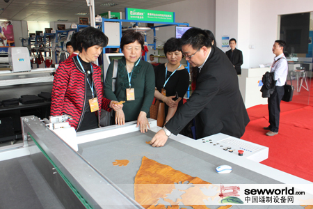 尹董事长向考察团介绍了和鹰科技展出的设备及系统,并重点演示了和鹰科技最新研发的HY-R1624数控裁剪机及三维人体测量系统。此外,尹董还向考察团一行汇报了公司目前提出的“服装数字化全面解决方案”的成果和未来发展思路。