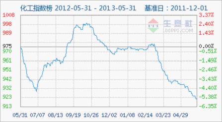 5月31日化工指数为921点,创下周期内的历史新低,较2012年03月13日最高点1016点下降了9.35%。(注:周期指2011-12-01至2013-05-31)