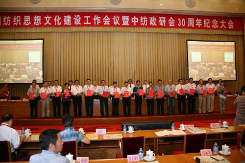 CTEI网讯(记者 刘亚非 摄影 姚建平) 8月23日,全国纺织思想文化建设工作会议暨中纺政研会建会30周年纪念大会在北京京西宾馆隆重召开。中国纺织工业联合会、中国纺织职工思想政治工作研究会会长王天凯作主题报告。中国纺织工业联合会名誉会长、中国纺织职工思想政治工作研究会名誉会长杜钰洲出席会议并为中纺政研会建会30周年题写寄语。中国思想政治工作研究会、中国机械工业职工思想政治工作研究会、中国兵器工业集团公司党建思想政治工作研究会为中纺政研会建会30周年发来了贺信。中国纺织工业联合会名誉会长林乃基,副会长孙瑞哲、陈树津、张延恺、杨纪朝、夏令敏等中国纺织工业联合会领导,国务院国资委、中国思想政治工作研究会、中国财贸轻纺烟草工会、中国机械工业职工政研会、中国煤炭职工政研会等部门相关负责人,以及部分省、区、市纺织行业协会和管理部门负责人、中纺政研会全体会员代表、中纺政研会历任老领导、新闻媒体负责人及代表等300余人出席了会议。大会由中国纺织工业联合会副会长、中国纺织职工思想政治工作研究会常务副会长杨纪朝主持。