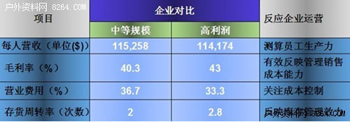 据美国户外产业协会(OIA)最新户外零售公司分析报告显示,在美国户外零售业中,中等规模或普通典型的零售企业年销售额大约290万美元上下,税前利润3.1%;而高利润企业年销售额为2,195,396美元,利润率高达9.3%。该报告还指出一个重要发现:普通典型的户外零售企业税前资产收益率达7.7%(即把税前利润折算成总资产比例),而高利润户外零售企业的总资产收益率高达30.7个百分点。