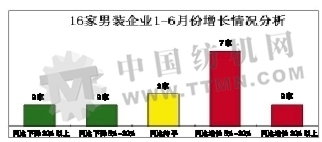 1-6月份,温州市服装商会对26家服装企业进行抽样调查,其中男装16家,女装企业6家,童装4家。26家企业1-6月销售总额为13.32亿元,其中亿元以上企业4家,5000万-7000万元企业7家,2000万-4000万元企业16家。调查中,增长最高的一家女装企业,同比增长40%;下降最高的一家男装企业,同比下降30%。