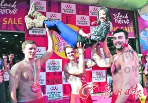 一名女孩被型男温柔抛起模仿美国感恩节后的“黑色星期五”,昨日,岗顶某百货推出全场3~4.5折优惠。并请来百名型男在低温的天气激情上演腹肌秀。