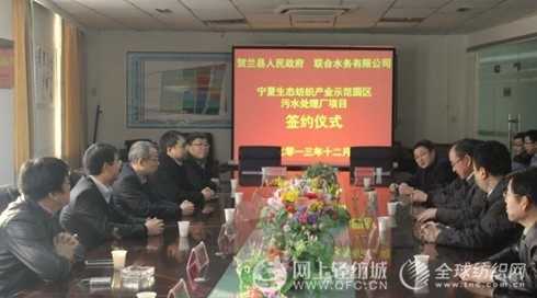 2013年12月27日上午,联合水务有限公司与宁夏回族自治区贺兰县人民政府举行了宁夏生态纺织示范园区污水处理项目的签约仪式。