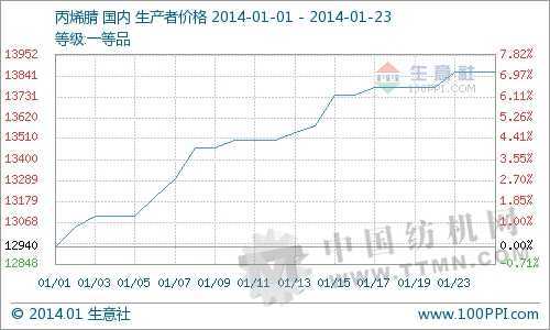 1月22日丙烯腈商品指数为100.25,与昨日持平,较周期内最高点103.25点(2013-03-29)下降了2.91%,较2012年12月03日最低点85.08点上涨了17.83%。(注:周期指2012-10-30至今)