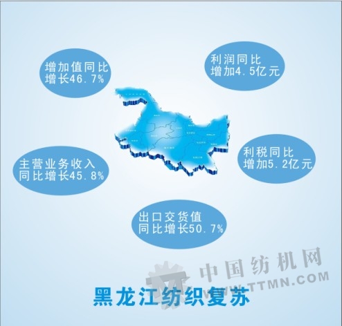2013年黑龙江省纺织行业累计完成增加值同比增长46.7%,主营业务收入同比增长45.8%,出口交货值同比增长50.7%,利税同比增加5.2亿元,利润同比增加4.5亿元。这组振奋人心的数字,描绘出黑龙江纺织发展转型升级的轨迹。