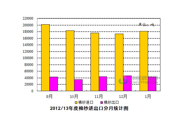据海关总署最新统计数据显示,2014年1月,我国进口棉纱18.09万吨,环比增长4.7%,同比减少0.54%;出口棉纱4.23万吨,环比减少7.76%,同比减少22.44%;净进口量为13.85万吨,环比增长9.21%,同比增长8.86%。 据海关总署发布的历史数据计算,2013年9月-2014年1月,我国累计进口棉纱91.32万吨,同比增长20.27%;累计出口棉纱20.85万吨,同比减少1.15%。