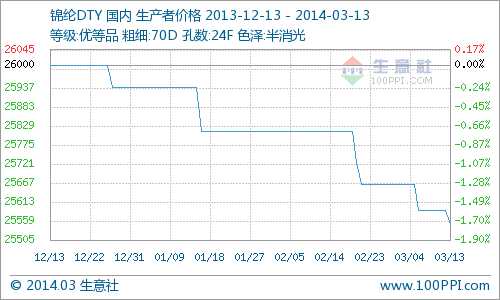 3月13日,江苏某厂家锦纶DTY70D/24F目前报价在25500元/吨,价格较前期下调300元/吨。目前原料市场价格小幅下跌,市场交易偏冷清,竞争较为激烈,下游针织品,机织布行业需求恢复缓慢,价格有所降低。