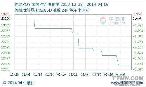 4月16日,浙江地区某厂家锦纶POY86D/24F价格在23000元/吨,价格较上周一致。原料市场价格有所提升,厂家库存量一般,下游厂家采购情绪不佳。