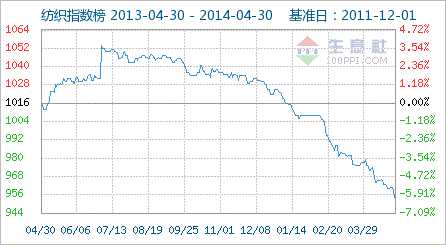 4月30日纺织指数为954点,较周期内最高点1074点(2013-02-19)下降了11.17%,较2012年07月01日最低点930点上涨了2.58%。(注:周期指2011-12-01至2014-04-30)