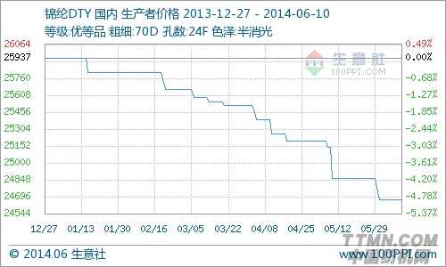 据生意社锦纶DTY价格监测,受原料市场及下游影响,最近三个月锦纶DTY一直呈现下跌态势。下游整体交投气氛不浓,厂家开工多在8成左右,预计短期内价格将保持稳定态势。