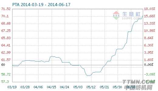 6月16日PTA交收指数为70.34,较昨日上升了0.74点,较周期内最高点101.75点(2011-09-22)下降了30.87%,较2014年05月11日最低点58.49点上涨了20.26%。(注:周期指2011-09-01至今)