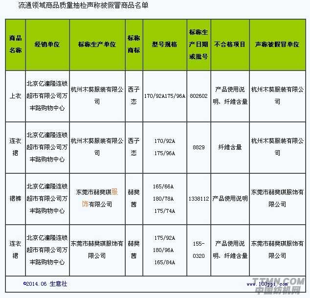 在2014年商品质量抽检工作中,北京市工商局对本市市场上销售的服装类商品进行了质量抽检。经生产企业或商品持有人信息反馈,有4组不合格商品为冒用商标或厂名厂址的假冒商品,经销单位均为“北京亿潼隆连锁超市有限公司万丰路购物中心”。