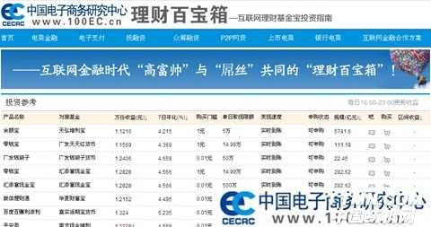近日,专业第三方电子商务研究机构与国内最大媒体服务平台——中国电子商务研究中心正式推出“网络理财百宝箱”(www.100ec.cn/zt/jjbbx/),打造最贴心的投资指南、最实用的理财平台、最真实的收益数据,是互联网金融时代“高富帅”与“屌丝”共同的“理财百宝箱”!