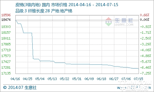 7月15日棉花价格小幅下跌,目前3128B级地产棉主流商谈价格在17100-17450元/吨。