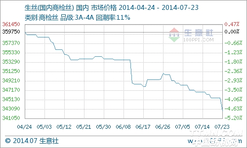 根据生意社价格监测,7月23日生丝(商检)市场价格创3个月以来价格又一新低,生丝行情继续延续低位偏弱走势,目前生丝主流商谈价格在342750元/吨左右,较上周下降4000元/吨左右。