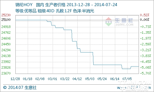 7月24日,福建地区锦纶HOY40D/12F目前报价在23500元/吨,价格较前期一样。原料价格几经上涨,下游经编市场较稳,厂家呼涨意向高,迫于成本压力,厂家多亏损经营。
