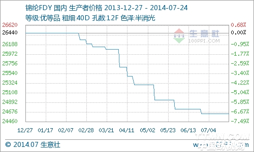 7月24日,福建地区某厂家锦纶FDY40D/12F报价在24500元/吨,浙江地区锦纶FDY40D/12F报价在25700元/吨,价格都较前期一样。市场仍处于低迷状态,涨价依旧阻力较大。