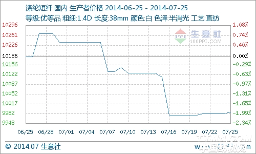 本周涤纶短纤市场行情平稳整理,涤短厂家报价略有浮动,但变化不大。周初报价9977元/吨,周末跌至9987元/吨。